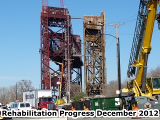 As of December 2012, the project was still ongoing. The bridge has been repainted, and as might be expected, the white paint has been replaced by the maroon paint that the city uses on nearly all of its bridges. The railroad bridge has actually played a major role in the rehabilitation of the highway bridge. The deck of the railroad bridge was converted to allow construction traffic to use the bridge. Also, walkways were added allowing workers to access the highway bridge from the railroad bridge. Concrete barriers were piled up on the highway bridge counterweights to keep the bridge weight in balance during construction. A visit to the bridge in June 2013 found the bridge open to traffic with rehabilitation mostly complete. Some minor items appeared to remain incomplete, such as the painting of some new truss members.