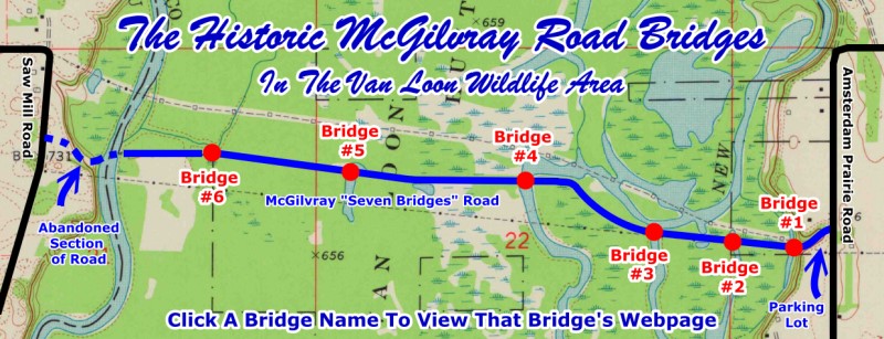 In addition to information specifically about Bridge #1 on McGilvray Road, this special webpage also provides both an overview of McGilvray Road in general and a general discussion of all six bridges remaining on McGilvray Road, followed by the discussion of McGilvray Road Bridge #1 specifically. Specific discussions for the other five bridges are located each on their own respective webpages. The below map shows McGilvray Road as it exists today. You can click on the name of a bridge to switch to that bridge's page.
