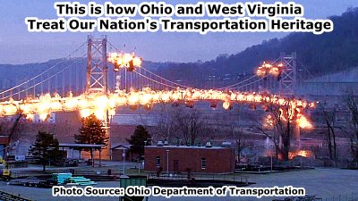 Despite its obvious historic and aesthetic value, and potential for reuse as a non-motorized crossing, this historic bridge was demolished. The DOTs who owned this bridge said that every year the structure continued to deteriorate, and so the weight limit had to keep being lowered. Perhaps this was instead an indication that the DOTs are failing, not the bridge. Perhaps if the bridge had been properly maintained it would not be falling apart. Although it is the same age, Michigan and Ontario's Ambassador Bridge continues to serve traffic as the busiest North American international crossing with a major user being heavy fully-loaded semi trucks! Even at the time of demolition, the Fort Steuben Bridge could have and should have been restored. But instead, WVDOT and ODOT insisted on wasting $2.3 Million to demolish this bridge. Millions of valuable taxpayer dollars that could be used for anything from preserving this historic bridge to simply making area highways smoother and safer are instead being used to destroy this bridge just for the sake of wiping it off the face of the earth. They should instead focus funding into restoring this historic landmark and allowing it to continue to beatify Steubenville, Weirton, and the Ohio River. Such a graceful structure as a suspension bridge deserves to be left standing. Even people who are not generally "bridge enthusiasts" will often stop and photo a suspension bridge, because they are so large and impressive. To demolish a bridge such as this one is an atrocity to be sure. Both Ohio and West Virginia should be ashamed of themselves, not only for failing to maintain this bridge in the past, but also for not choosing to restore the bridge and make up for their past errors. Particular blame for this wasteful decision must be laid at ODOT's feet, since they acted as lead agency for the project. The demolition of the Fort Steuben Bridge is ridiculous.