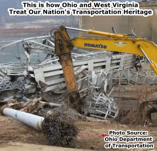 According to the above statement from the Department, the Ohio Department of Transportation takes pleasure in irreversibly destroying extremely rare historic bridges. Its hard to argue with their statement, given the number of historic bridges that Ohio has demolished in recent years. States like Ohio and Pennsylvania make the number of historic bridges destroyed in World War II in Europe seem modest. Indeed, ODOT and the hired demolition contractor carried out the complete destruction of this landmark far more efficiently and effectively than any wartime bomb could have, evidence of how much experience demolition contractors have the opportunity to gain, thanks to highway agencies like ODOT. When the Fort Steuben Bridge was built, engineers and contractors of the time could not have imagined how the demolition of a bridge like this could be brought down to a science that would destroy what they spent years designing and building in a matter of seconds. It is unfortunate that the Department might not instead take pleasure in preserving beautiful historic landmarks that would enhance the quality of life in Ohio.