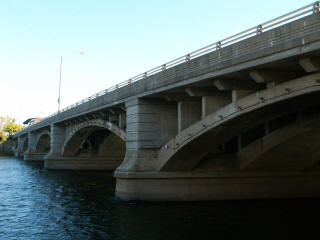 Grand Rapids has a beautiful downtown downtown area, with a developed area of skyscrapers and other downtown buildings along the impressive Grand River, Michigan's longest river. There are a number of historic bridges spanning this river in the downtown area, and they play a major role in forming the beauty and interest in the downtown area. The Fulton Street Bridge is one of those bridges. Its graceful arch spans provide a nice contrast to the intricate complexity of the nearby truss bridge also spanning the river. The bridges have lights on their superstructures to outline their distinctive shapes during the night.